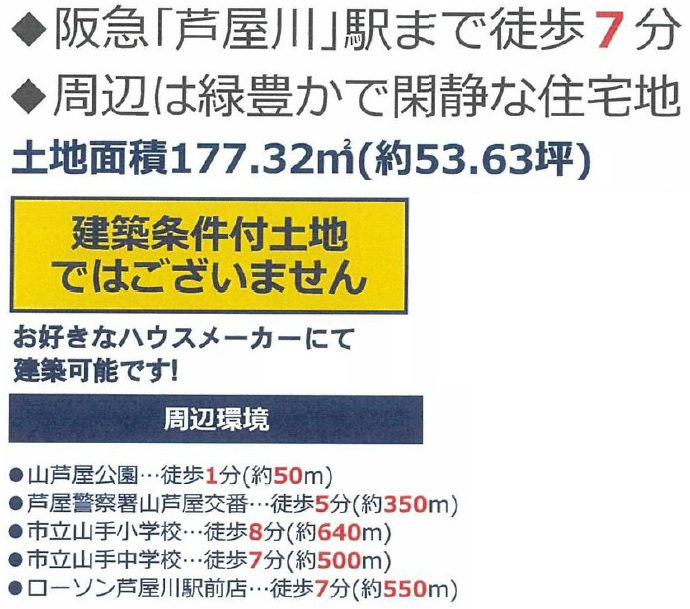 ◆北東側公道幅員約4.5mに間口約18.5mが面す ◆建築条件なし/お好きなハウスメーカーや工務店で建築可能です ◆古家あり ◆阪急「芦屋川駅」徒歩7分/JR「芦屋駅」徒歩18分 ◆山芦屋公園・徒歩1分/山手サンモール・徒歩7分/ローソン芦屋川駅前店・徒歩8分 ◆閑静な住宅街です |
