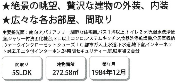 ◆土地面積約84.82坪あり ◆建物面積約82.45坪の5SLDKです ◆西宮市内と大阪湾一望のパノラマ眺望あり ◆駐車場は並列2台駐車可 ◆建替え用の土地としてもご検討ください ◆阪急「夙川駅」・「苦楽園口駅」とJR「芦屋駅」へバス便あり ◆緑豊な閑静住宅街です |