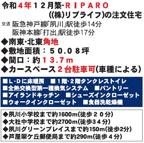 ◆土地面積約50.08坪あり ◆2022年8月築で建物面積約43.70坪の4SLDKです ◆LDKは約23.2帖あり/LDは床暖房付/アイランドキッチンは食洗器付/全熱交換型第一種換気システム/ウォークインクローゼットあり/シューズクローゼットあり ◆カースペース2台分あり ◆夙川グリーンプレイスが目の前です ◆阪急「夙川駅」徒歩12分/JR「芦屋駅・徒歩16分/阪神「香櫨園駅」徒歩16分 ◆夙川グリーンプレイス・徒歩1分/コープミニ大谷・徒歩3分/芦屋翠ケ丘郵便局・徒歩4分/皿池公園・徒歩5分 |