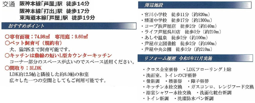 ◆専有面積74.98㎡の3LDKです ◆LDKは約12.5帖あり/全居室に窓あり/西側に専用庭あり ◆2024年11月リフォーム済:ガスコンロ・レンジフード・キッチン水栓交換/浴室シャワー水栓交換/洗面化粧台交換/洗濯パン交換/トイレ交換(温水洗浄便座付)/フローリング上貼/クロス全室張替/CF張替/トイレのCF貼替/畳・襖・障子交換/等 ◆ペット2匹まで飼育可(規約あり) ◆阪神「芦屋駅」徒歩12分/JR{芦屋駅」徒歩15分/JR「芦屋駅」へバス7分「呉川町」バス停まで徒歩3分 ◆コープ浜芦屋・徒歩2分/芦屋市立図書館・徒歩2分/ライフ芦屋呉川町店・徒歩3分/セブンイレブン芦屋呉川町店・徒歩3分/芦屋中央公園・徒歩3分 |