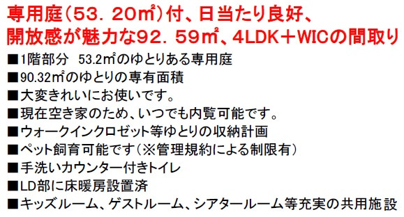 ◆2009年(平成21年)2月築で専有面積90.32㎡の4LDKです/1階のお部屋で専用庭53.20㎡あり ◆LDKは約15.5帖あり/LDはガス温水式床暖房付/キッチンは浄水器一体型シャワー水栓とディスポーザー・食洗機付/全居室に窓と収納あり/洋室約6.0帖はウォークインクローゼット付/1620サイズの浴室は窓がありミストサウナ機能付浴室暖房乾燥機あり/トイレは温水洗浄便座付で手洗いカウンターあり/バリアフリー・アウトポール設計/玄関前にアルコーブあり ◆敷地内駐車場・承継可 ◆ペット2匹まで飼育可(規約あり) ◆キッズルーム・オーディオシアタールーム・来客用宿泊ゲストルームなど共用施設充実/24時間ゴミ出し可/365日日勤管理 ◆阪神「芦屋駅」へバス8分「浜風大橋」バス停まで徒歩1分/JR「芦屋駅」へバス12分「浜風大橋」バス停まで徒歩1分 ◆セブンイレブン潮芦屋店・徒歩2分/ライフガーデン潮芦屋・徒歩3分(スーパーマルハチやコーナン等あり) ◆芦屋市陽光町8-20 |