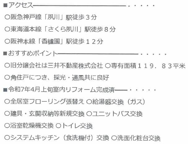 ◆三井不動産(株)旧分譲のマンションで専有面積119.83㎡の3LDKです ◆LDKは約29.5帖あり/全洋室に窓と収納あり/全居室6帖以上あり/南東側と南西側にバルコニーあり ◆マンション1階部分に中庭あり/オートロック付 ◆2025年4月リフォーム済:システムキッチン交換(食洗機付)/ユニットバス交換(暖房乾燥機)/洗面化粧台交換/トイレ交換/給湯器交換/建具・玄関収納交換/フローリング張替/クロス張替/CF張替/ハウスクリーニング/等 ◆敷地内駐車場・空き有り20,000円/月 ◆阪急「夙川駅」徒歩3分/JR「さくら夙川駅」徒歩8分/阪神「香櫨園駅」徒歩12分 ◆夙川グリーンタウン(ダイエーや専門店街あり)・徒歩1分/セブン-イレブン 阪急夙川駅南口店・徒歩2分/夙川公園(片鉾池)・徒歩2分 |