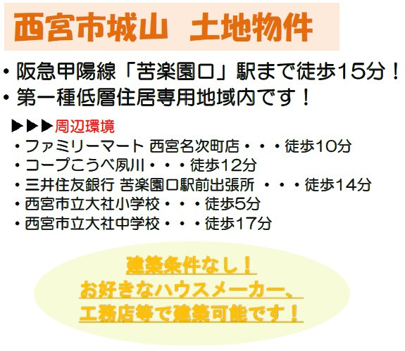 ◆建築条件なし/お好きなハウスメーカーや工務店で建築可 ◆南公道幅約5.47mに間口約10.8mが面す ◆更地につき即建築可 ◆阪急「苦楽園口駅」徒歩15分・「夙川駅」徒歩18分/JRさくら夙川駅」徒歩20分/阪急バスも利用可 ◆ニテコ池・徒歩2分/ファミリーマート西宮桜谷店・徒歩歩6分 |