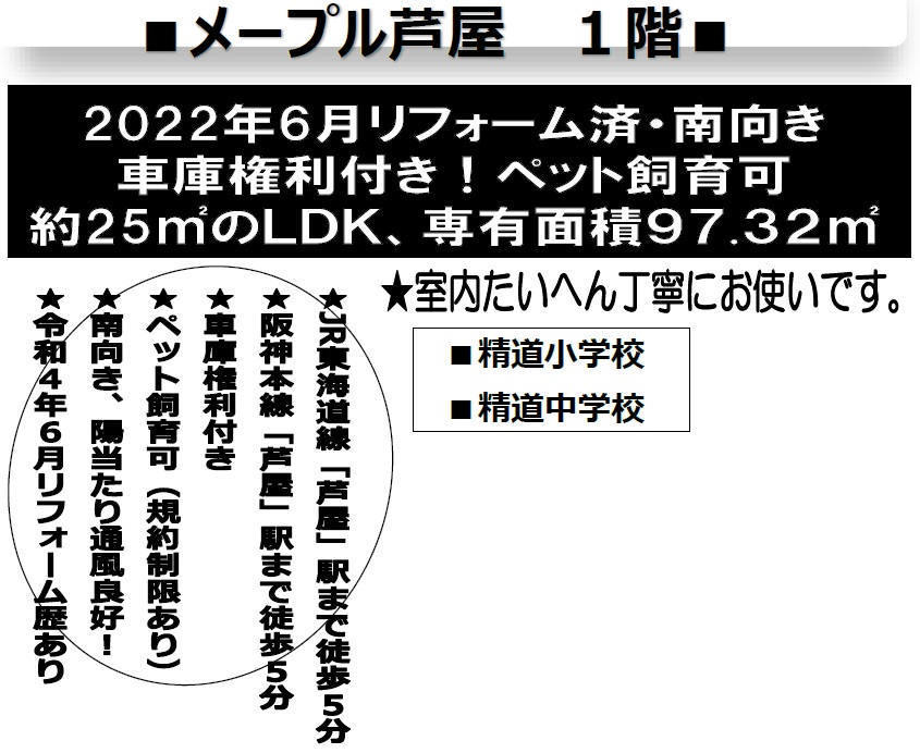 ◆専有面積97.32㎡の3LDKで専用庭約30㎡あり大型ウッドデッキ設置(使用料1,000円/月) ◆LDKは約25.6帖あり/全居室6帖で各部屋に窓あり ◆2022年10月の室内全面リフォーム履歴あり:システムキッチン交換/ユニットバス交換/洗面化粧台交換/トイレ交換/洗濯パン交換/給湯器交換/建具交換/フロアタイル貼り/クロス張替/CF貼替/ウッドデッキ新設/等 ◆分譲駐車場・権利付(管理費4,850円/修繕積立金2,230円・月) ◆ペット相談可(規約あり) ◆JR「芦屋駅」徒歩5分/阪神「芦屋駅」徒歩6分/阪急「芦屋川駅」徒歩12分 ◆大枡公園・徒歩2分/いかりスーパーJR芦屋店・徒歩5分/パントリー芦屋店・徒歩6分/コープデイズ芦屋(ラポルテ東館)・徒歩9分 |