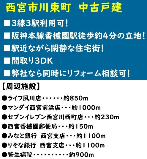 ◆3DKの間取りです ◆阪神「香櫨園駅」徒歩4分/JR「さくら夙川駅」徒歩13分/阪急「夙川駅」徒歩16分 ◆夙川オアシスロード・徒歩1分/サンディ香櫨園店・徒歩3分/西宮市立図書館・徒歩4分/セブンイレブン西宮香櫨園店・徒歩6分/川添公園・徒歩6分/マンダイ西宮前浜店・徒歩13分 ◆人気の香櫨園小学校・浜脇中学校区です |