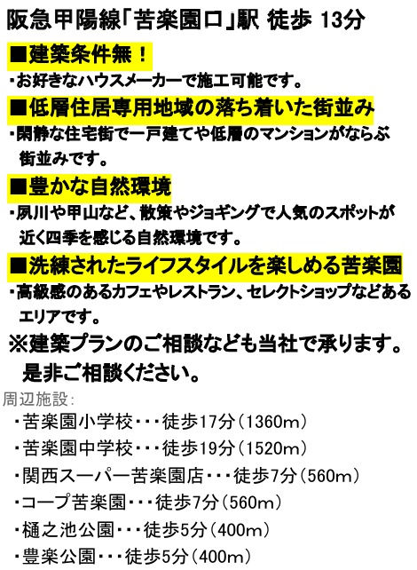 | 交通 | 阪急甲陽線 苦楽園口駅まで 徒歩13分 |