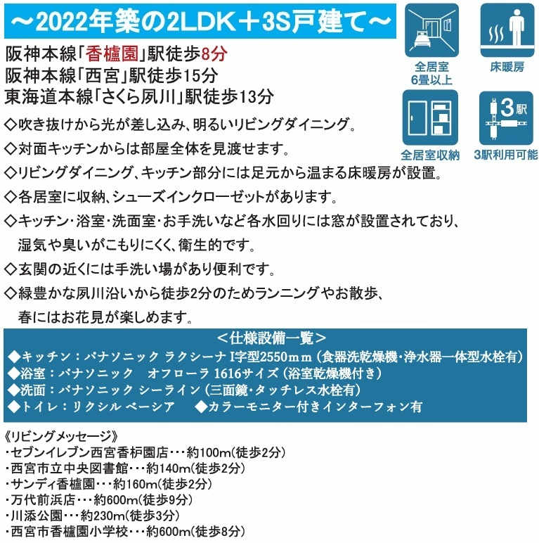 ◆2022年3月築で建物面積約38.22坪の4SLDKです ◆LDKは約18.9帖あり床暖房付(畳コーナーもあり)/システムキッチンは浄水器と食洗機付/納戸表示のお部屋は洋室です/1616サイズの浴室は暖房乾燥機付/洗面化粧台はタッチレス水栓付/玄関にシューズインクローゼットあり/2階と3階にバルコニーあり ◆阪神「香櫨園駅」徒歩8分・「西宮駅」徒歩15分/JR「さくら夙川駅」徒歩15分/阪急「夙川駅」徒歩21分 ◆サンディ香櫨園店・徒歩2分/セブンイレブン西宮香櫨園店・徒歩2分/川添公園・徒歩2分/夙川公園・徒歩2分/西宮市立図書館・徒歩2分/スーパーマンダイ西宮前浜町店・徒歩7分/御前浜公園(香櫨園浜)・徒歩10分 ◆人気の香櫨園小学校・浜脇中学校区です |