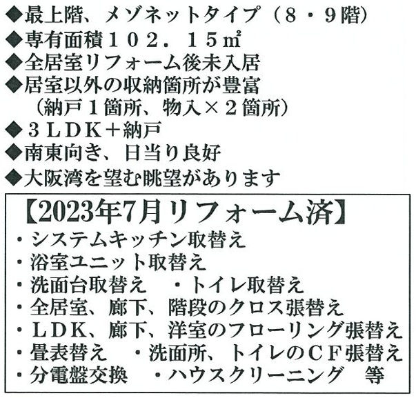◆最上階・8階と9階建お部屋で西宮市内と大阪湾一望の眺望あり ◆専有面積102.15㎡の4LDKです ◆LDKは約15帖あり/納戸約3.5帖は窓があり洋室や書斎としても利用可/LDKと廊下に物入あり/トランクルーム付(使用料は管理費に含む) ◆2023年7月フルリフォーム済:システムキッチン交換/ユニットバス交換/洗面化粧台交換/トイレ交換/給湯器交換/LDKダウンライト設置/分電盤交換/フローリング張替/クロス張替/CF張替/畳表替え/スイッチパネル交換/等 ◆ペット飼育可(規約あり) ◆阪急「夙川駅」徒歩13分/JR「芦屋駅」徒歩18分 ◆敷地内にビューハイツクリニックあり/コープミニ大谷・徒歩2分/芦屋翠ケ丘郵便局・徒歩3分/夙川グリーンプレイス・徒歩5分 |