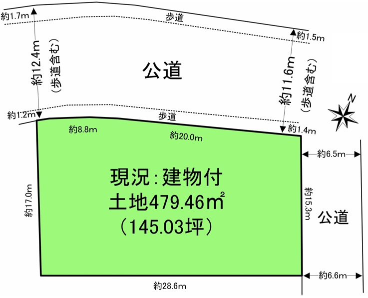| 接道 | 東 6.5m(幅員) 公道 15.3m(接面) 北 11.6m(幅員) 公道 28.8m(接面) |