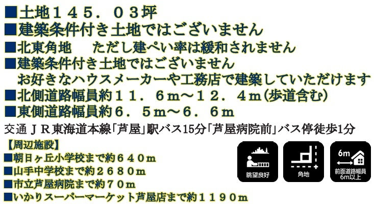 ◆南ひな壇立地で芦屋市内と海を望む眺望あり ◆建築条件なし/お好きなハウスメーカーや工務店で建築可 ◆古家あり ◆JR「芦屋駅」バス10分「芦屋病院南口」バス停から徒歩1分 ◆芦屋市民病院・徒歩5分/ローソン芦屋市民病院店・徒歩1分/山麓公園・徒歩3分/芦屋セントマリア病院・徒歩7分/朝日ケ丘公園・徒歩10分 |