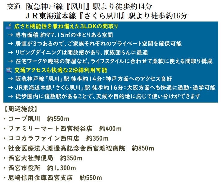 JR東海道線 さくら夙川駅まで 徒歩15分 阪神本線 西宮駅まで 徒歩15分 |