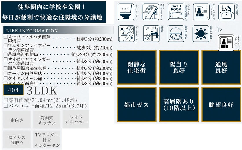 ◆1999年(平成11年)1月築で安藤忠雄設計/大林組施工のデザイナーズマンションです ◆専有面積71.04㎡の3LDKです ◆LDKは約15.1帖あり/全居室に収納あり/フルフラット設計です ◆敷地内駐車場・空き有り(10,000円~11,000円/月) ◆阪神「芦屋駅」へバス8分「潮芦屋中央」バス停まで徒歩1分/阪神「芦屋駅」とJR「芦屋駅」と阪急「芦屋川駅」へバス便あり ◆ライフガーデン潮芦屋(スーパーマルハチやコーナン等あり)徒歩2分/セブンイレブン潮芦屋店・徒歩1分/陽光北公園・徒歩3分/親水中央公園・徒歩6分/芦屋総合公園・徒歩10分 |