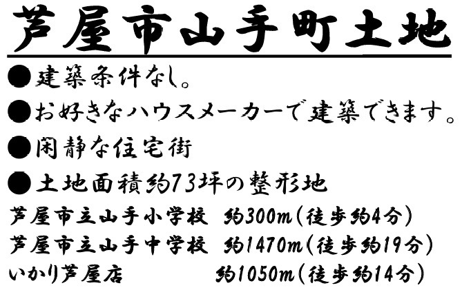 ◆南側道路幅員約4.5mに間口約14.3mが面した整形地です ◆更地につき即建築可 ◆建築条件なし/お好きなハウスメーカーや工務店で建築可能です <br />◆区画の整った閑静住宅街です <br />◆阪急「芦屋川駅」徒歩12分/JR「芦屋駅」と阪急「芦屋川駅」へ阪急バス「山手町」バス停まで徒歩5分 |