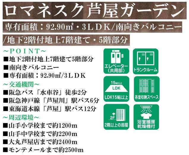 | 交通 | 阪急神戸線 芦屋川駅まで バス4分 停歩2分