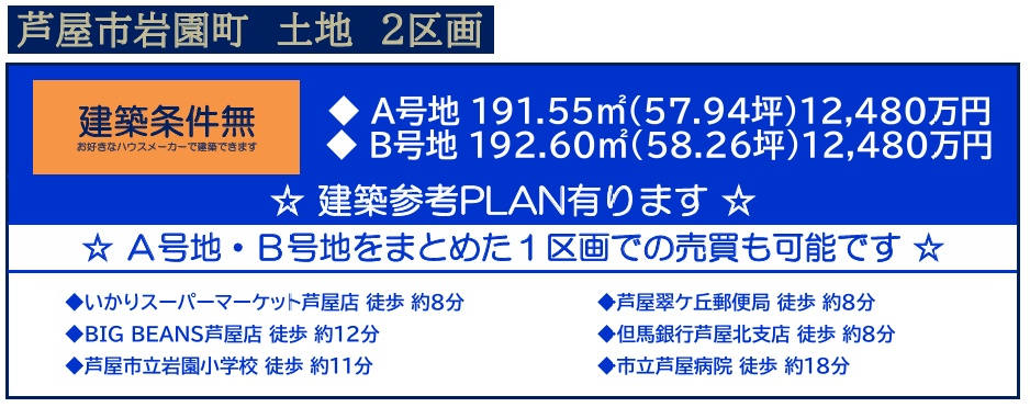 ◆東側公道幅員約6.0mに面した整形地です ◆建築条件なし/お好きなハウスメーカーや工務店で建築可 ◆更地につき則建築可 ◆2区画分譲で一括での販売も可 ◆阪急「夙川駅」徒歩15分・「芦屋川駅」徒歩20分/JR「芦屋駅」徒歩23分/ ◆仲之池・徒歩2分/岩園公園・徒歩4分/いかりスーパー芦屋店・徒歩6分/芦屋東山郵便局・徒歩7分/夙川グリーンプレイス・徒歩11分 |