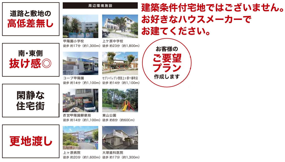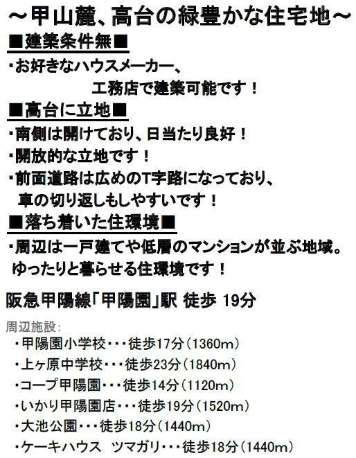 ◆建築条件なし/お好きなハウスメーカーや工務店で建築可 ◆売主負担で更地渡し ◆コープ甲陽園・徒歩14分/いかりスーパー甲陽園店・徒歩19分/阪急オアシス甲陽園店・徒歩20分 ◆阪急「甲陽園駅」徒歩19分 |