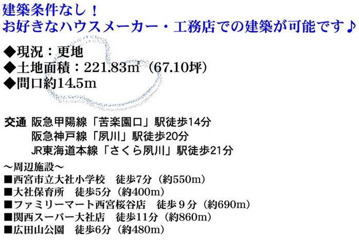 ◆西側公道幅員約4.2m(以上)に間口約14.5mが面した整形地です ◆更地につき即建築可 ◆建築条件なし/お好きな名薄メーカーや工務店で建築可 ◆土地面積約136.18坪あり ◆阪急「苦楽園口駅」徒歩14分・「夙川駅」徒歩20分/JRさくら夙川駅」徒歩24分 ◆ニテコ池・徒歩3分/広田山公園・徒歩4分/ファミリーマート西宮名次町店・徒歩9分/ウエルシア西宮北名次店・徒歩9分 |