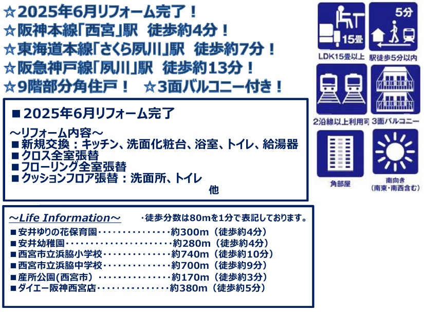 ◆9階のお部屋で西宮市内を望む眺望あり ◆専有面積81.60㎡の3LDKです ◆LDKは約17.5帖あり/キッチンに勝手口あり/全居室に収納あり/浴室に窓あり/南側と西側と北側の3カ所にバルコニーあり ◆2025年6月リフォーム済:システムキッチン交換/浴室交換/洗面化粧台交換/給湯器交換/トイレ交換/フローリング張替/クロス張替/CF張替/ハウスクリーニング/等 ◆敷地内駐車場・空き無し20,000円/月 ◆ペット飼育可(規約あり) ◆阪神「西宮駅」徒歩4分/JR「さくら夙川駅」徒歩7分/阪急「夙川駅」徒歩15分 ◆エビスタ西宮・徒歩2分/西宮郵便局・徒歩2分/産所公園・徒歩2分/エイヴィスプラザ(ダイエーや医療フロアあり)・徒歩5分 ◆人気の浜脇小学校・浜脇中学校区です |