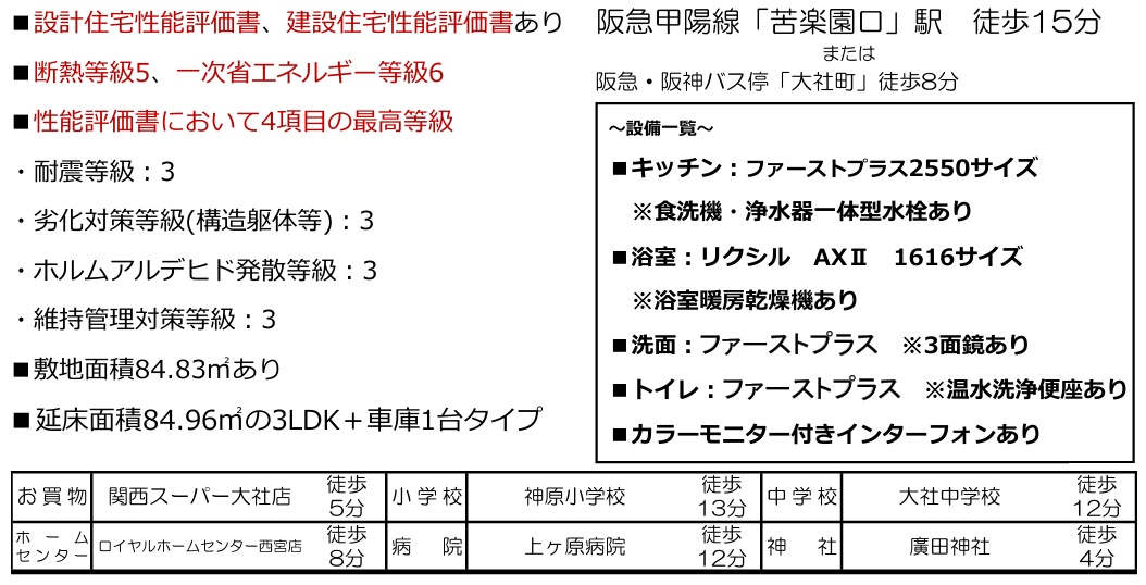 ◆土地面積約25.66坪あり ◆建物面積約25.7坪の3LDKです ◆LDKは約15.12帖あり/システムキッチンは食洗機と浄水器一体型水栓付/全居室に窓と収納あり/浴室は暖房乾燥機付/駐車場あり ◆阪急「苦楽園口駅」徒歩15分 ◆広田山公園・徒歩2分/関西スーパー 大社店・徒歩5分/ロイヤルホームセンター西宮店・徒歩8分 ◆西宮市大社町4-13 |