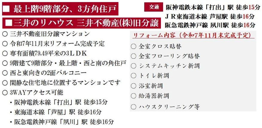 | 特徴 | ◆9階の南東西の角部屋で陽当たり通風良好!/芦屋市内を望む眺望あり