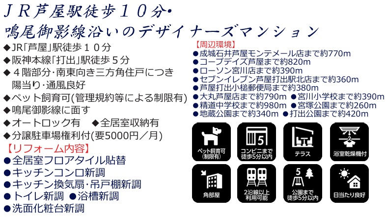 阪神本線 打出駅まで 徒歩5分 阪神本線 阪神芦屋駅まで 徒歩8分 |