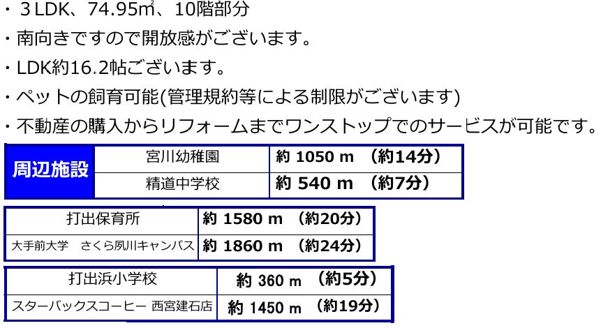 ◆10階のお部屋で海を望む眺望あり♪ ◆専有面積74.95㎡の3LDKです ◆LDKは約16.2帖あり/全居室に収納あり/バリアフリー設計です ◆オートロック付/宅配ボックス付 ◆敷地内駐車場・空き有り(13,000円~16,000円/月)/来客用駐車場有り ◆ペット飼育可(規約あり) ◆阪神「打出駅」徒歩13分/JR「芦屋駅」バス10分「南宮町西」バス停徒歩6分 ◆香枦園浜(御前浜公園)・徒歩2分/セブンイレブン西宮大浜店・徒歩2分/大東公園・徒歩3分/芦屋南宮郵便局・徒歩4分/コープ打出浜・徒歩5分/KOHYO(コーヨー)芦屋南宮店・徒歩8分/西宮回生病院・徒歩8分 ◆打出浜小学校・徒歩2分/精道中学校・徒歩7分/大東保育所・徒歩3分 |