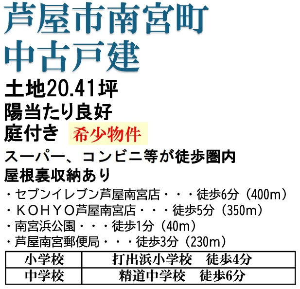 ◆全室に南側に窓があり明るいです/屋根裏収納あり ◆閑静な住宅街です ◆阪神「打出駅」徒歩10分/JR「芦屋駅」バス10分「南宮町」バス停徒歩4分 ◆南宮浜公園・徒歩1分/芦屋南宮町郵便局・徒歩4分/KOHYO(コーヨー)芦屋南宮店・徒歩6分/セブンイレブン芦屋南宮町・徒歩7分 |