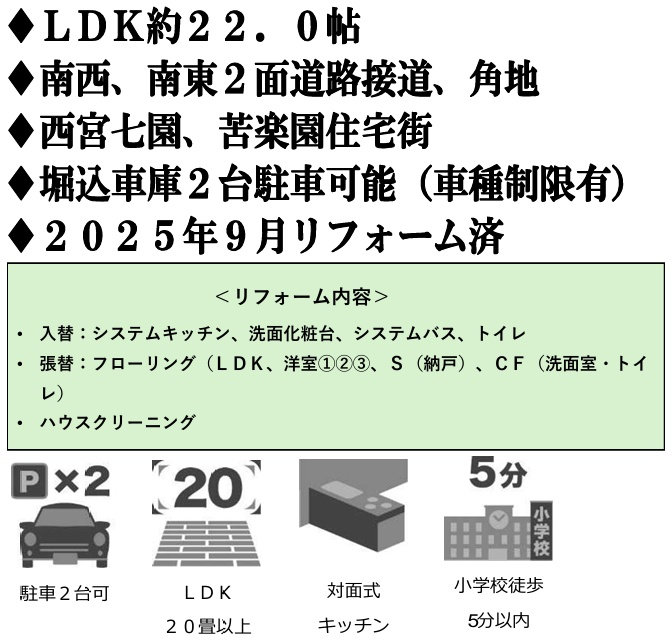 ◆南ひな壇立地で西宮市内と大阪湾一望の眺望あり ◆土地面積約55.92坪あり ◆2005年5月築で建物面積約45.92坪の4LDKです ◆2025年9月リフォーム済:システムキッチン交換/ユニットバス交換/洗面化粧台交換/トイレ交換/フローリング張替/クロス貼替/CF貼替/ハウスクリーニング/等 ◆ビルトインガレージは並列2台駐車可 ◆阪急「夙川駅」バス13分「苦楽園」バス停徒歩7分・「苦楽園口駅」バス9分「苦楽園」バス停徒歩7分/JR「芦屋駅」バス13分「苦楽園」バス停徒歩7分 |