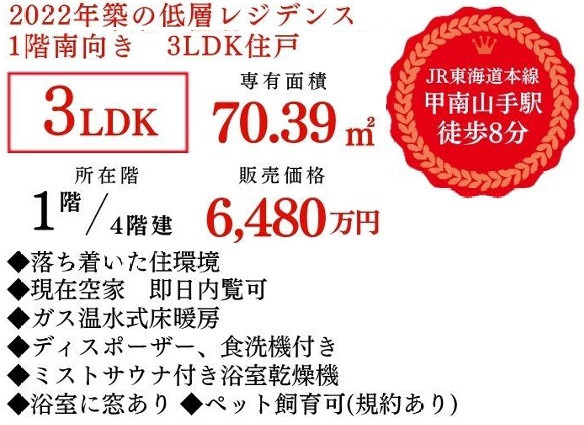 ◆2022年(令和4年)3月築の美宅です ◆専有面積70.39㎡の3LDKです ◆LDKは約16.7帖あり/LDの2カ所に床暖房あり/システムキッチンは食洗機とディスポーザー付/全居室に窓と収納あり/浴室は窓がありミストサウナ機能付の暖房乾燥機あり ◆敷地内駐車場・空き有り(8,000円/月) ◆ペット飼育可(規約あり) ◆JR「甲南山手駅」徒歩8分・「JR芦屋駅」徒歩15分/阪急「芦屋川駅」徒歩11分/阪神「芦屋駅」徒歩11分 ◆清水公園・徒歩3分/前田公園・徒歩3分/セルバ甲南山手(関西スーパー等あり)・徒歩5分 |