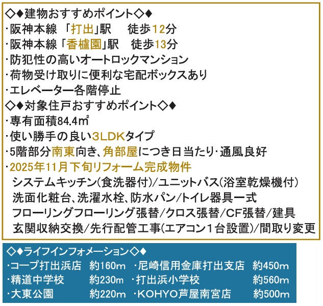 ◆専有面積84.4㎡の3LDKです ◆LDKは約13.1帖あり/全居室に窓と収納あり/南東側と北東側の2カ所にバルコニーあり/屋上にトランクルーム付(使用料無料)/エントランスはオートロック付 ◆エレベータ―停止階です ◆2025年11月下旬リフォーム済:システムキッチン交換(食洗機付)/ユニットバス交換(暖房乾燥機付)/洗面化粧台交換/洗濯水栓交換/洗濯機用防水パン交換/トイレ交換(温水洗浄便座付)/フローリング張替/クロス張替/CF張替/建具交換/玄関収納交換/エアコン1台設置/間取り変更/ハウスクリーニング/等 ◆阪神「打出駅」徒歩12分 ◆コープ打出浜・徒歩2分/コーヨー(KOHYO)芦屋南宮店・徒歩4分/大東公園・徒歩3分/堀切さくら公園・徒歩3分/打出浜小学校・徒歩5分/精道中学校・徒歩3分 |