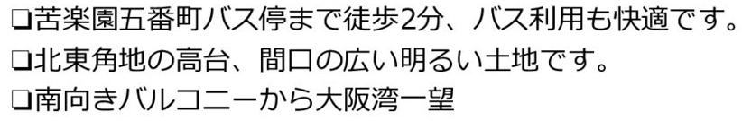 ◆JR「芦屋駅」バス12分「苦楽園五番町」バス停徒歩2分/阪急「夙川駅」バス13分「苦楽園五番町」バス停徒歩2分/阪急「苦楽園口駅」バス10分「苦楽園五番町」バス停徒歩2分