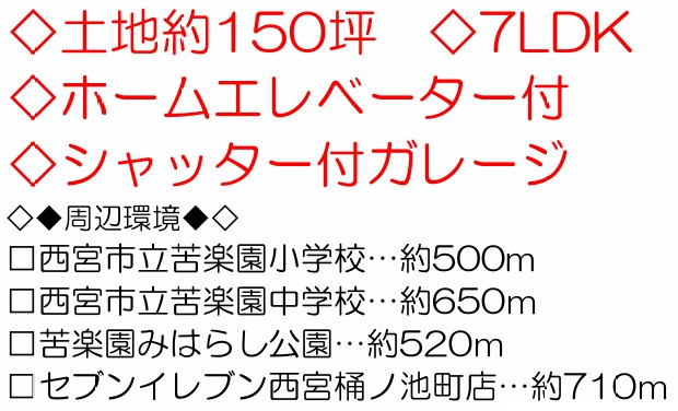 ◆苦楽園六番公園・徒歩1分/関西スーパー苦楽園店・徒歩11分/セブンイレブン西宮樋之池町店・徒歩11分/コープ苦楽園・徒歩15分 |