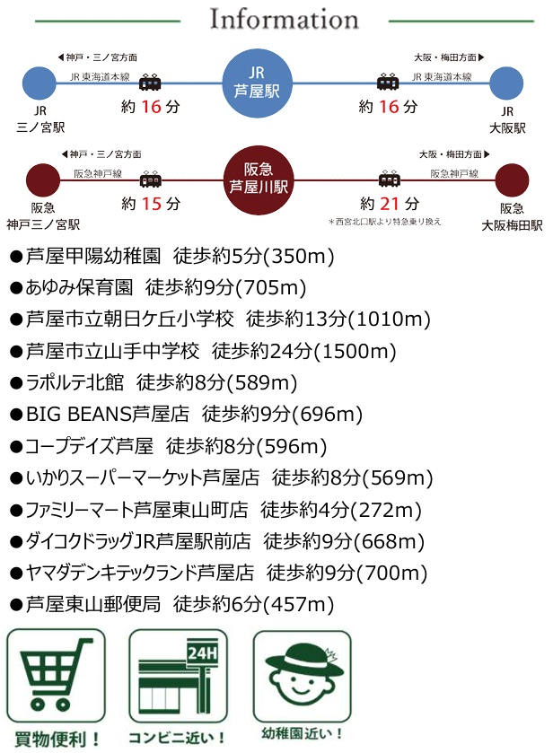◆JR「芦屋駅」・阪急「芦屋川駅」へ「前山公園」バス停徒歩3分/阪急「芦屋川駅」徒歩16分/JR「芦屋駅」徒歩19分 |