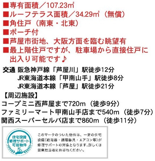 ◆三条公園・徒歩5分/山手サンモール(阪急芦屋川駅からの商店街)・徒歩7分/コープミニ西芦屋・徒歩8分/セルバ甲南山手(関西スーパー等が入った複合施設)・徒歩9分