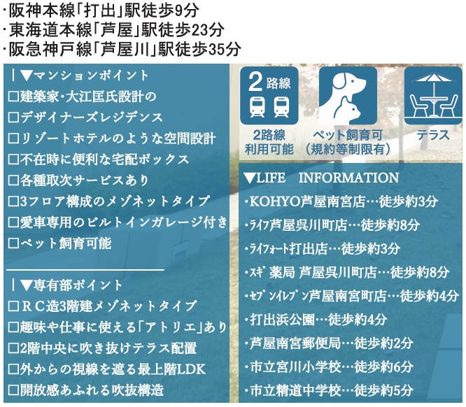 ◆阪神「打出駅」徒歩7分/JR「芦屋駅」バス7分「宮川小学校前」バス停徒歩3分