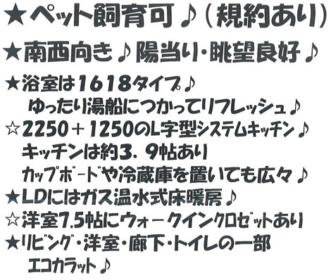 ◆LDKは約16.4帖あり/LDはガス温水式床暖房付/システムキッチンは食洗機付/全居室に窓と収納あり/浴室はミストサウナ機能付の暖房乾燥機付/給湯機はエコジョーズ/玄関前にアルコーブあり/住宅性能評価書あり