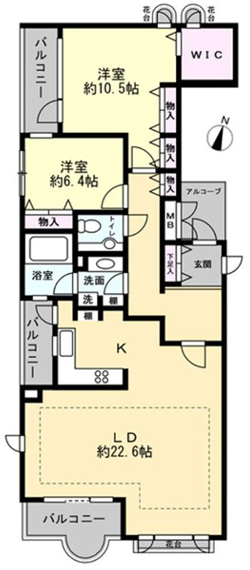 ◆LDは約22.6帖あり/主寝室は約10.5帖ありウォークインクローゼットと物入あり/キッチンに窓あり/南側と北西側と北側の3ヶ所にバルコニー付