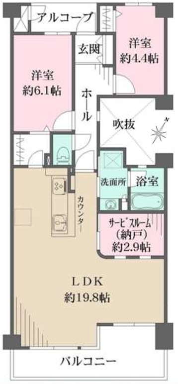 ◆LDKは約19.8帖あり/全居室に窓と収納あり/サービスルーム(納戸)約2.9帖は書斎などとしても利用可/玄関前にアルコーブあり