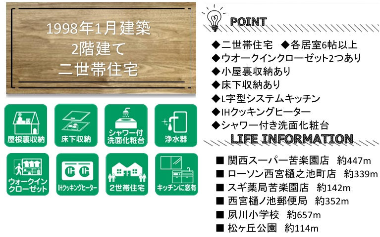 | 交通 | 阪急甲陽線 苦楽園口駅まで 徒歩11分 阪急神戸線 夙川駅まで 徒歩15分 JR東海道線 さくら夙川駅まで 徒歩24分 |