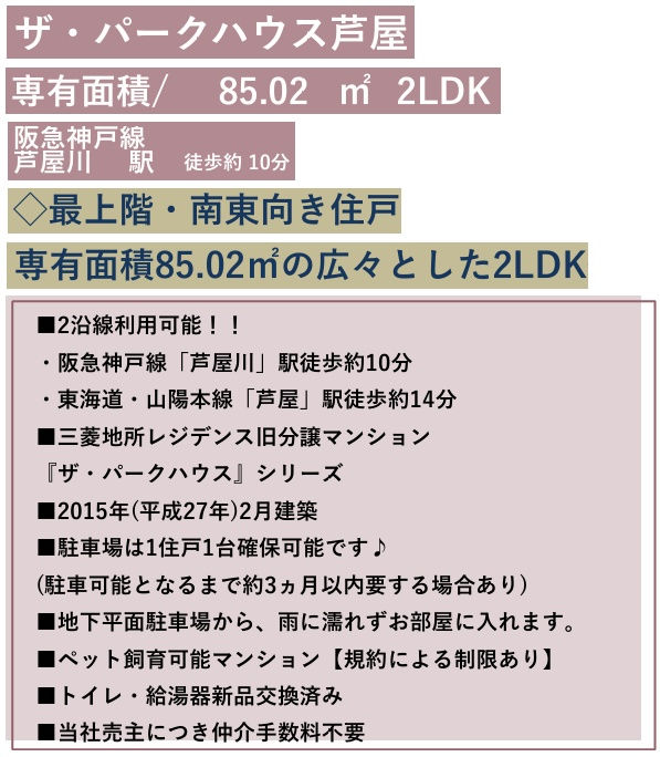 ◆阪急「芦屋川駅」へバス4分「水車谷」バス停まで徒歩2分/JR「芦屋駅」へバス8分「水車谷」バス停まで徒歩2分/阪急「芦屋川駅」徒歩20分 |