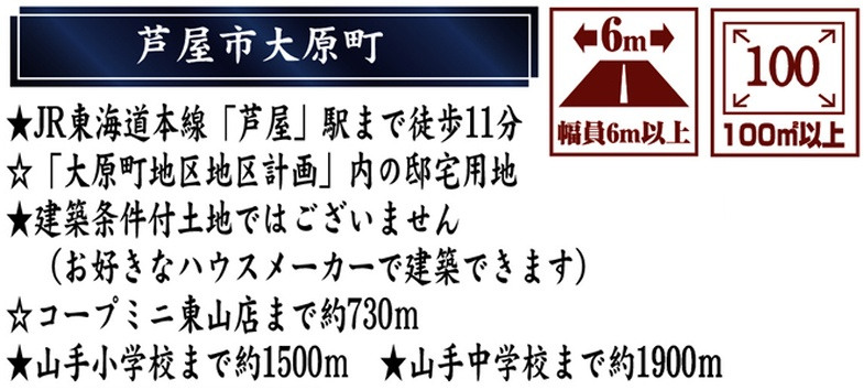 ◆建築条件なし/お好きなハウスメーカーや工務店で建築可能です <br />◆区画の整った閑静住宅街です <br />◆阪急「芦屋川駅」徒歩12分/JR「芦屋駅」と阪急「芦屋川駅」へ阪急バス「山手町」バス停まで徒歩5分