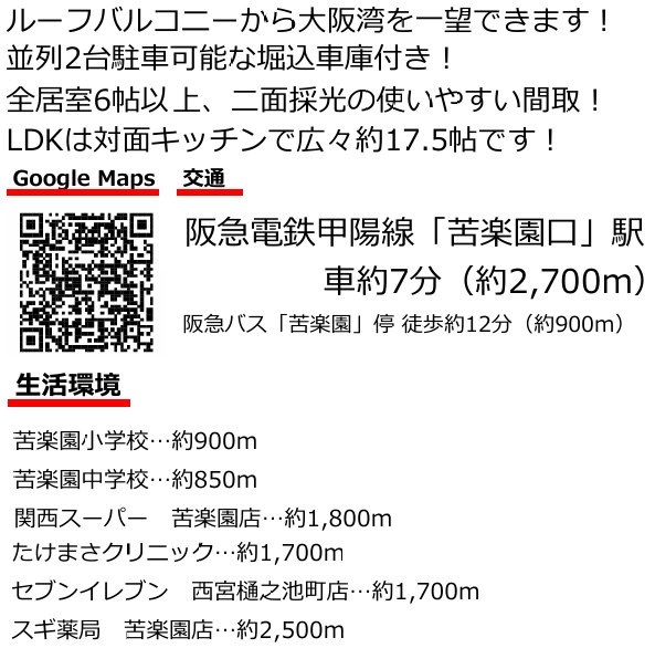 ◆阪急「夙川駅」へバス12分「苦楽園」バス停まで徒歩8分・「苦楽園」バス9分「苦楽園」バス停まで徒歩8分/JR「芦屋駅へバス12分「苦楽園」バス停まで徒歩8分 |