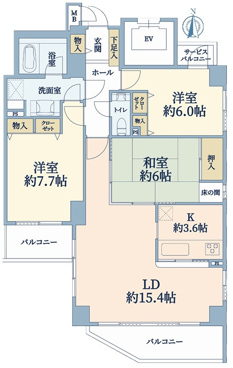 ◆LDKは約15.3帖あり/全居室6帖以上で各部屋に窓と収納あり/南側と東側の2か所にバルコニーあり/玄関前に門扉付きの専用ポーチ5.7uあり/専用ポーチに物入あり