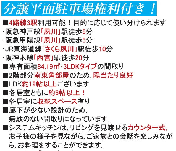 ◆阪急「夙川駅」徒歩11分/JR「さくら夙川駅」・徒歩18分/JR「芦屋駅」徒歩22分/阪神「香櫨園駅」徒歩19分/山手幹線に「みなと観光」路線バスあり