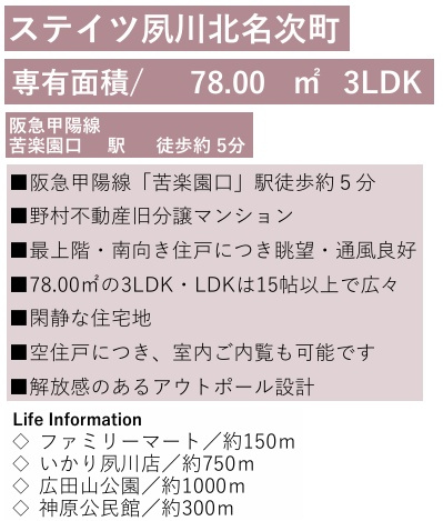 ◆夙川公園・徒歩1分/ファミリーマート西宮獅子ケ口店・徒歩1分/ウエルシア西宮北名次店・徒歩6分/いかりスーパー夙川店・徒歩9分 |