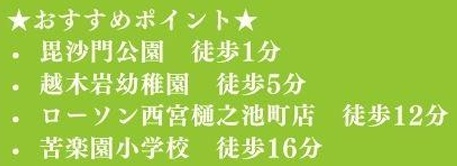 ◆毘沙門公園・徒歩1分/樋之池公園・徒歩9分/コープ苦楽園・徒歩12分/関西スーパー苦楽園店・徒歩13分 |