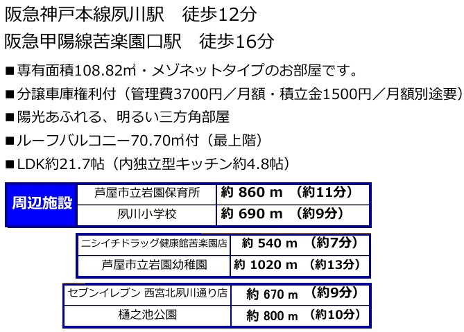 ◆阪急「夙川駅」徒歩14分・「苦楽園口駅」徒歩15分/JR「さくら夙川駅」徒歩21分