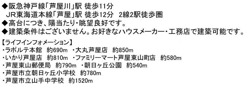 | 交通 | 阪急神戸線 芦屋川駅まで 徒歩11分 JR東海道線 JR芦屋駅まで 徒歩12分 阪急神戸線 芦屋川駅 |