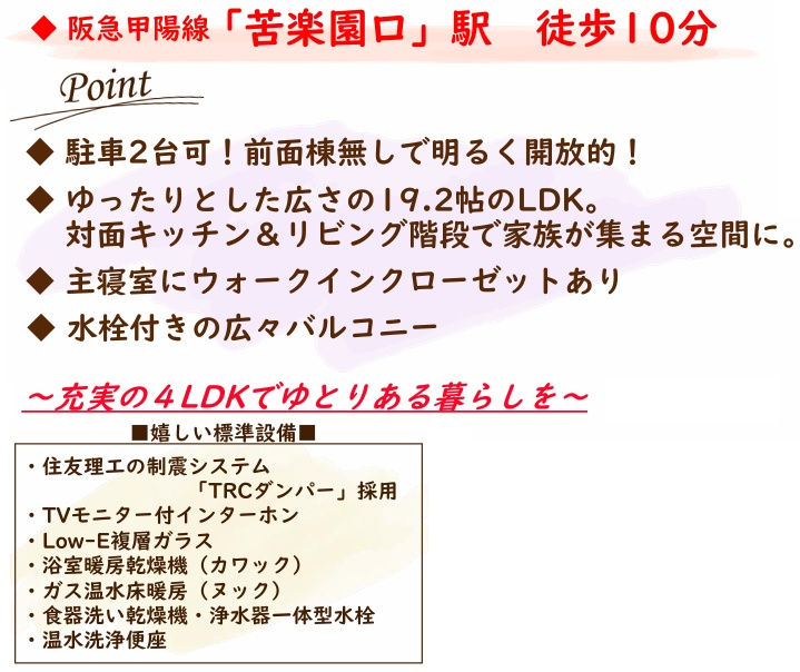 | 交通 | 阪急甲陽線 苦楽園口駅まで 徒歩8分 | 学校区 | 小学校区:神原小学校 300m 中学校区:大社中学校 550m |