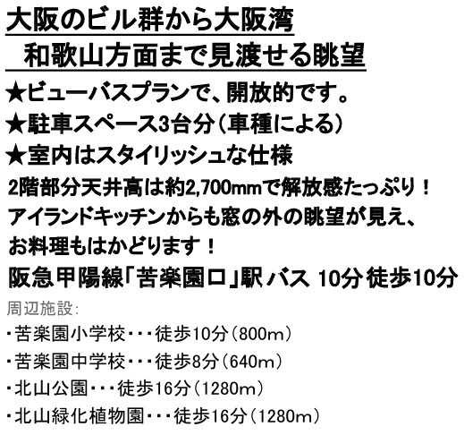 | 交通 | 阪急神戸線 夙川駅まで バス13分 停歩10分 JR東海道線 JR芦屋駅まで バス13分 停歩10分 阪急甲陽線 苦楽園口駅まで バス9分 停歩10分 |